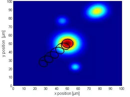 通過圓形抖動確定梯度的圖形描述,即調制觀察到的耦合功率(或其他量)。相對于抖動的調制相位表示朝向最大值的方向,而其幅度在適當情況下降至0