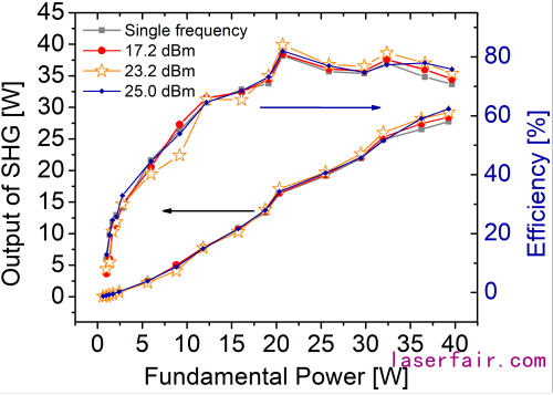 為此,研究人員提出了少頻激光諧振倍頻的方法以進(jìn)一步提高可見光光纖激光的輸出功率。實驗中,對單頻激光進(jìn)行周期性相位調(diào)制后,光纖放大獲得高功率的1064nm少頻激光。調(diào)節(jié)相位調(diào)制頻率與倍頻腔自由光譜區(qū)一致,在腔鎖定后實現(xiàn)了少頻激光的腔內(nèi)諧振增強。驗證實驗中獲得了30W的532nm倍頻激光,效率超過80%,與單頻情況一致。相位調(diào)制法被廣泛應(yīng)用于抑制受激布里淵散射,獲得高功率窄線寬光纖激光,數(shù)千瓦數(shù)十GHz線寬的光纖激光亦有報導(dǎo)。因此,該方法有望突破單頻光纖激光的功率限制,獲得高效率千瓦級可見光激光。