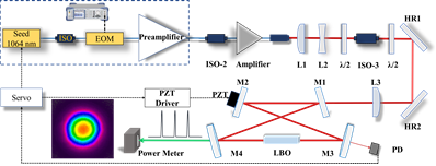 ??高功率可見激光在天文與地球物理、量子信息技術(shù)等領(lǐng)域有著廣泛的應(yīng)用。光纖激光外腔諧振倍頻是一種獲得高效率高功率可見光激光的手段。但是,對于諧振腔倍頻,一般需要入射基頻光為單頻激光,而單頻光纖激光的功率受限于受激布里淵散射,因此通過倍頻獲得的可見激光的功率同樣受限。