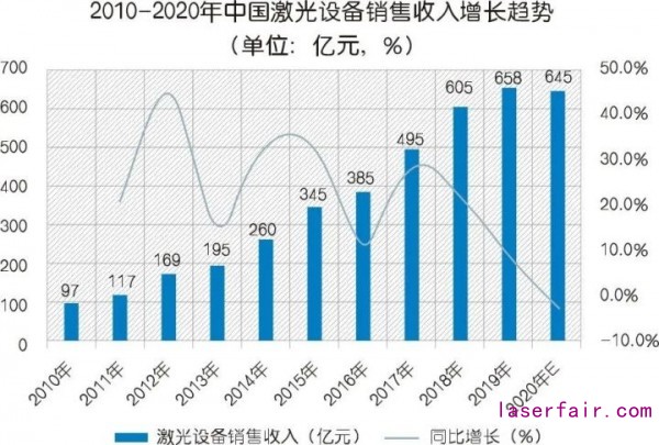 2019年激光市場雖然有所增長,但與前兩年相比增速開始放緩,全部領域的激光設備(含進口)市場銷售收入為658億元,同比增長8.8%。受全球經濟走勢不確定的影響,預計2020年中國激光設備市場整體銷售收入為645億元,將出現近十年來首次負增長,但其前景依然廣闊,絕對量不小。