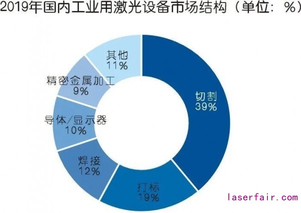工業激光設備市場中,激光切割應用最為廣泛,占比達到39%,打標與焊接分列第二、三位,占比分別為19%、12%。