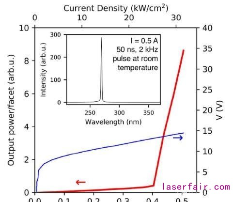 在激光二極管中,“p型”和“n型”層被“量子阱”隔開。當電流通過半導體激光器時,p型層中的正電荷空穴和n型層中的負電荷電子將聚集到中心,最終以光子的形式釋放能量。研究人員設計的量子阱發射深紫外光。他們用Gan鋁制備了p型層、n型層和包層。覆蓋層位于p和n型地層的兩側。通過摻雜將硅雜質添加到n型層下方的包層中,并通過分布偏振摻雜將其他雜質添加到p型層上方的包層中。p層一側的覆蓋層設計為底部最高,逐漸減少至頂部。研究人員認為鋁梯度可以增強帶正電空穴的流動。最后,制備了Mg摻雜Gan鋁的表面接觸層。在實驗中,研究人員發現,只有當脈沖電流達到13.8伏特的低工作電壓時,偏振摻雜p層才能發出迄今為止最短波長的紫外光。