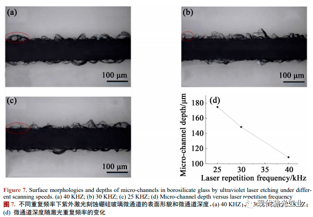 2018 年李奇思等人使用 355 nm 全固態(tài)紫外激光器對(duì)硼硅玻璃表面和雕刻深度、底面光滑度、通道 垂直情況進(jìn)行研究,實(shí)驗(yàn)分析優(yōu)化加工參數(shù),得到了材料表面損傷小、裂紋少、雕刻深度大、切面垂直 且平整的硼硅玻璃微通道[30]如圖 7 所示。