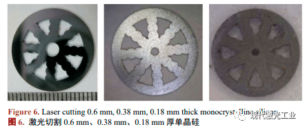 在科學(xué)技術(shù)和現(xiàn)代工業(yè)的快速發(fā)展的信息化時(shí)代,要達(dá)到在更小空間內(nèi)搭建更多的實(shí)驗(yàn)系統(tǒng)并實(shí)現(xiàn) 更多的功能,就要加快信息技術(shù)的發(fā)展更重要的是要制作加工出更小型化、微型化并且僅對(duì)材料表面化 學(xué)鍵進(jìn)行處理[22]的功能齊全的器件。在軍事雷達(dá)通訊[23]、醫(yī)學(xué)治療、航空航天和生物化學(xué)等領(lǐng)域具有 重要的應(yīng)用和研究?jī)r(jià)值。可以在納米尺度的微光學(xué)元件上進(jìn)行更加深入的切割和優(yōu)化并研究和開(kāi)發(fā)應(yīng)用,轉(zhuǎn)變傳統(tǒng)的光學(xué)元器件功能和特性。微光學(xué)元件具有容易批量生產(chǎn)和易于實(shí)現(xiàn)陣列化還有簡(jiǎn)小輕便靈活 等優(yōu)點(diǎn),但是它的主要材料是石英玻璃。石英玻璃在應(yīng)用和處理過(guò)程中很容易產(chǎn)生裂紋和凹坑,是一種 硬脆性材料,這就使其光學(xué)性能大大減弱。因此,紫外激光的直寫(xiě)“冷”加工技術(shù)[24]大大提高了微光學(xué)器 件的效率,迅速完成高精度微細(xì)結(jié)構(gòu)的微光元器件加工且不傷材料,可以靈活完成大小批量的不同需求 的加工。國(guó)外科研機(jī)構(gòu)對(duì)紫外紫外加工硅片的研究比較早[25],國(guó)內(nèi)起步較晚隨后才對(duì)硅片切割技術(shù)及切面進(jìn)行研究[26]。十幾年前,張菲等人利用自己研發(fā)的紫外全固態(tài)激光對(duì)微加工系統(tǒng)進(jìn)行了研究,對(duì)相同 材質(zhì)的三種(0.18 mm、0.38 mm、0.6 mm)的硅片進(jìn)行優(yōu)化切割,最小孔徑 45 μm,加工精度 20 μm,結(jié)果 表明材料沒(méi)有出現(xiàn)裂痕,激光的熱影響較小,飛濺物較少[27]如圖 6 所示。