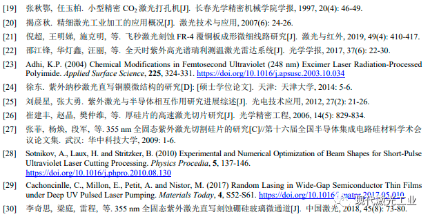 近幾年來(lái),紫外激光對(duì)半導(dǎo)體材料的微加工受到了越來(lái)越多的關(guān)注。成千上萬(wàn)的密集電路元件在集 成電路中非常常見(jiàn),所以就需要一些高精密的處理和加工方法[28],還有一些高精儀器和器件的硅和藍(lán)寶 石等半導(dǎo)體材料等半導(dǎo)體薄膜的精密微加工靠紫外激光且研究薄膜的光譜特性[29],同時(shí)紫外激光還可以 加大硅材料對(duì)光能的利用率,也可以使得硅表面的微結(jié)構(gòu)發(fā)生改變,有利于太陽(yáng)能電池板的研發(fā),如二 維微光柵等。