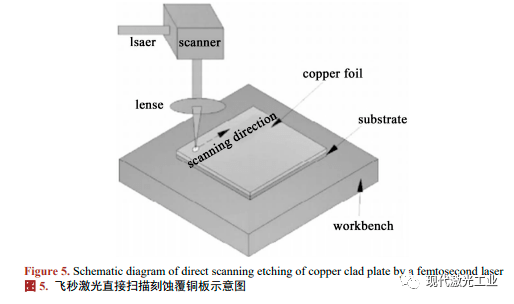 在工業(yè)領(lǐng)域中多種電路板的生產(chǎn)制作過(guò)程,從最開(kāi)始的布線到生產(chǎn)成需要高級(jí)工藝的微小精密的嵌入式芯片,集成電路板內(nèi)的柔性電路、聚合物和銅的層布式電路都需要鉆微孔和切割[17],也包括電路板上材料的修復(fù)和檢測(cè),常需要用到等微細(xì)加工和處理。電路板加工中激光微加工技術(shù)顯然成為最佳選擇。激光在加工過(guò)程中,工作機(jī)器不與被加工產(chǎn)品接觸,有效避免機(jī)械作用力,加工迅速,靈活性高,并且對(duì)工作場(chǎng)合無(wú)需特殊要求,通過(guò)對(duì)激光參數(shù)的精準(zhǔn)設(shè)置和研究設(shè)計(jì),可以達(dá)到微米以下量級(jí)[18]。電路板上用的比較傳統(tǒng)的鉆孔方式是利用紫外激光器和 CO2激光器用于非金屬打標(biāo)(波長(zhǎng)為 10.6 μm 的 CO2激光器用于非金屬材料打標(biāo);波長(zhǎng) 1064 nm 或者 532 nm 一般用于金屬材料打標(biāo)[19])。目前還是主要采用紫外激光加工技術(shù),可以達(dá)到微米級(jí)的加工,精確度高,可以制作超細(xì)微零器件,可以應(yīng)用于小于 1 μm 光斑 的激光束的微孔加工。但是 CO2 激光器主要打 75~150 mm 的孔,且小孔易錯(cuò)位,而紫外激光器可以打 25 mm 以下的孔,精度高且不會(huì)錯(cuò)位[20]。例如在用紫外飛秒激光“冷”加工覆銅線路板中利用綜合平 衡法得到最優(yōu)工藝參數(shù),再用選擇性刻蝕的特性達(dá)到高質(zhì)量、高效率線寬 50 μm、線間距 20 μm 的覆銅 板表面微細(xì)線路刻蝕加工[21]如圖 4 和圖 5 所示。