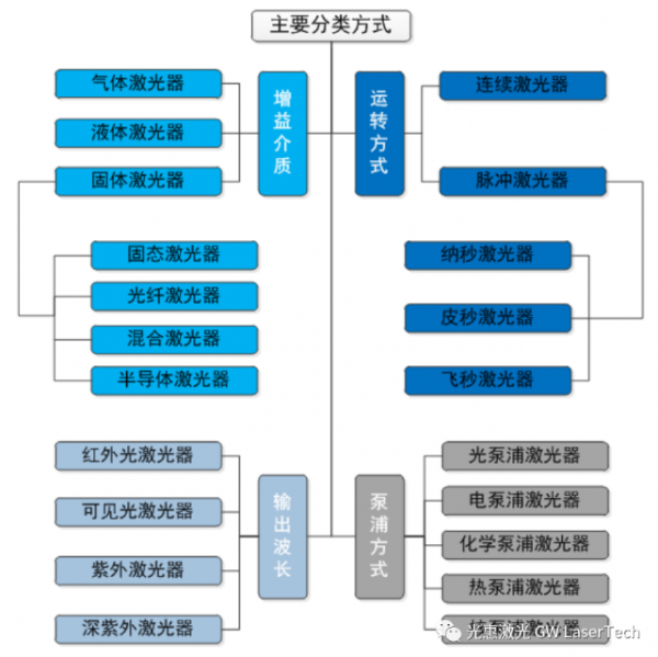 激光器種類繁多,分類標準各異,但以增益介質、運轉方式、泵浦方式和輸出波長為標準的分類方式 最為常見。