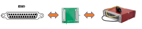 為了擴(kuò)展控制其他類型激光器,408SCAN控制器本體上增設(shè)有一個擴(kuò)展接口,以擴(kuò)展fiber激光器為例,通過擴(kuò)展接口進(jìn)行連接擴(kuò)展板,轉(zhuǎn)換TTL信號后進(jìn)行對應(yīng)控制激光器的激光使能、紅光開關(guān)以及8位數(shù)字量控制能量,使用指令配置EXIO接口,配置連接擴(kuò)展板。