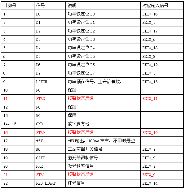EXIO接口經(jīng)轉(zhuǎn)換板轉(zhuǎn)接之后,對應(yīng)激光器引腳如表所示,表中紅色字體為輸入信號,其他為輸出信號