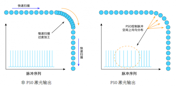 PSO(position synchronized output)即位置同步輸出,通過采集實(shí)時(shí)的編碼器反饋(或輸出的脈沖)進(jìn)行位置比較,與激光器同步輸出信號進(jìn)行相位同步,在運(yùn)動軌跡的所有階段以恒定的距離(而非時(shí)間)間隔觸發(fā)輸出開關(guān),包括加速、減速和勻速段,從而實(shí)現(xiàn)脈沖能量均勻地作用在被加工物體上。