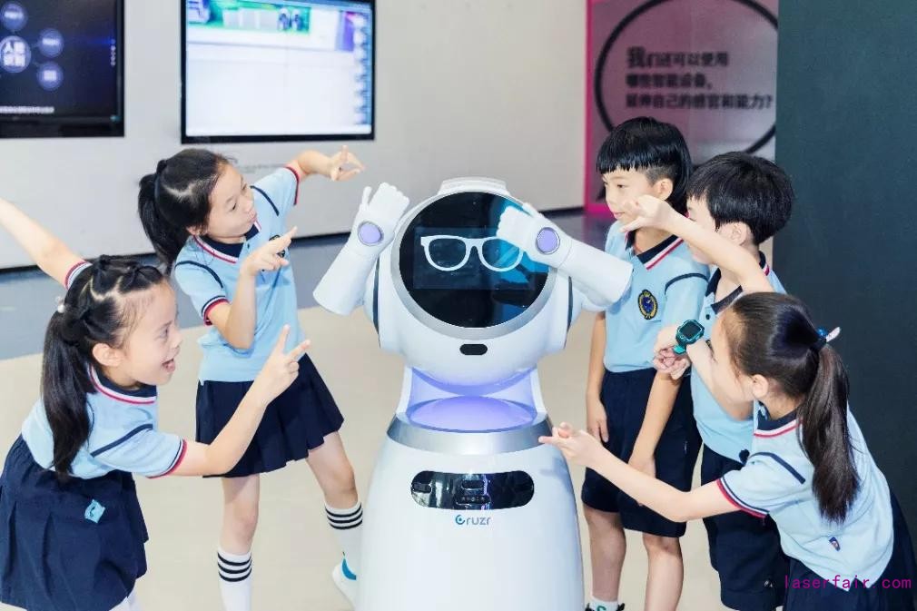 小學生們在杭州余杭人工智能教育基地和智能機器人互動