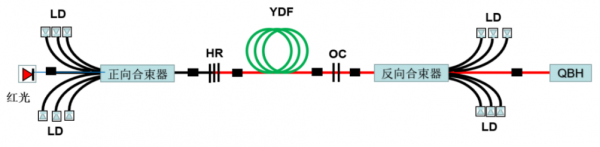 諧振腔結構光纖激光器原理:通過前向和后向的合束器,將泵浦半導體激光器LD的功率經過光纖光柵(高發光柵HR、低反光柵OC)注入到摻鐿雙包層光纖(YDF)中。YDF中稀土離子吸收泵光后,形成粒子數反轉分布,產生自發輻射光,然后在光纖光柵對(HR-OC)的作用下形成受激輻射光放大產生激光,并經過OC和輸出光纜QBH輸出出來。