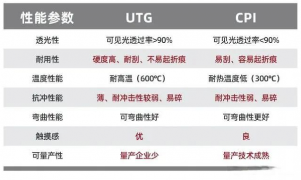 柔性蓋板是折疊手機的核心材料,而CPI屏幕雖然很薄、很軟,但是亮度很低,屏幕透光性不好且屏幕并不平整,折痕也大。整體的觀感一般,UTG玻璃屏幕則就不會出現這些問題,CPI →UTG是大方向。