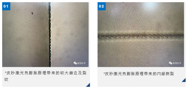 皮秒激光因為主要靠熱膨脹作用促使孔與孔之間形成熱裂紋,從而實現整個側壁的形成。在此過程中,孔的內壁經受了比較大的熱沖擊,比較容易生成側裂紋或者暗裂紋。崩邊量也比較大,往往在3~5um。