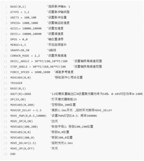 本文以光纖激光器為例,采用控制器的LASER激光電源接口連接光纖激光器,配合脈沖軸的運動控制,完成激光加工。