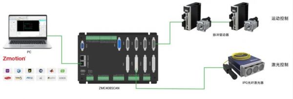 1.ZMC408SCAN實現(xiàn)激光加工包含運動控制與激光控制兩大部分,只需一臺ZMC408SCAN控制器便可實現(xiàn)振鏡控制+激光能量控制+運動軸控制。 (2)激光控制:通過LASER、支持PWM功能的OUT輸出口或者EXIO擴展接口連接市面上常用的多種類型的激光器。使用MOVE_OP指令控制激光開關(guān),MOVE_PWM指令調(diào)節(jié)激光的頻率和占空比,另外還有MOVE_DELAY指令和MOVEOP_DELAY指令控制開關(guān)光的延時。 (1)ZMC408SCAN內(nèi)置高精度PSO位置同步輸出功能,在加工圓角、曲線部分時即使進行了減速調(diào)整,在高速加工的場合,也能控制激光輸出的間距保持恒定; (2)支持激光振鏡控制和振鏡反饋,包含2個振鏡接口,支持2D振鏡和3D振鏡,配合不帶加減速的運動指令MOVESCAN,拐角處振鏡加工自動延時,完成精準(zhǔn)高效的激光控制,提高激光加工設(shè)備的產(chǎn)能; (3)通過指令在運動中靈活的調(diào)節(jié)激光開關(guān)/關(guān)光延時,響應(yīng)快,精確到us級別的控制,且設(shè)置過程簡單,大大縮短了工程師的調(diào)參時間; (4)自帶LASER激光器控制接口,支持支持IPG、YLR、YLS等類型激光電源,還帶一個EXIO擴展IO接口,通過定制轉(zhuǎn)接板,靈活控制市場上主流的各種激光器; (5)支持PC同時控制16個ZMC408SCAN控制器同時工作,形成一種振鏡陣列的激光加工。 (6)板載4路高速差分脈沖輸出,并帶4路高速差分編碼器反饋,支持EtherCAT總線驅(qū)動器的控制,支持5軸XYZAC軸的插補,支持振鏡軸與運動軸混合插補。 1.控制器的接口說明如下表: