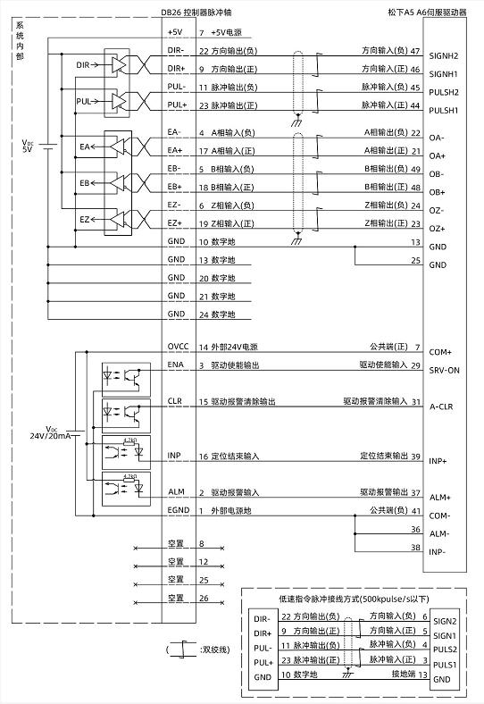 與松下A5/A6伺服驅(qū)動器差分接線參考示例:
