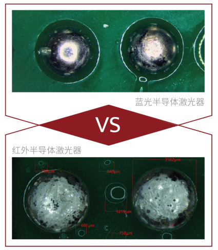 使用藍光半導體激光器的焊錫產品,其工藝效果和表面一致性明顯好于普通紅外激光器,能夠有效提升高精密電子元器件的品質。