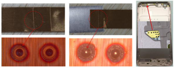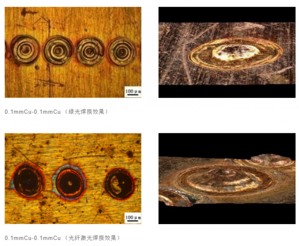 采用綠光激光分別對0.1mm厚紫銅與0.1mm厚紫銅搭接焊,以及0.1mm厚紫銅與0.2mm厚鋁合金搭接焊。焊后表面無需清理,無飛濺產生,焊點大小均勻,焊點成型好,焊接質量高,同時,在焊接過程中保持穩定,所需能量也更低。