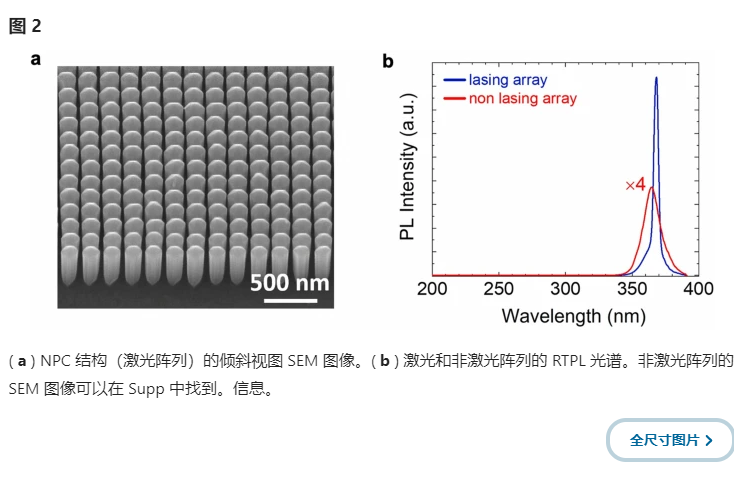進一步注意到,在這項研究中,與從頂部收集的激光強度相比,從側面收集的激光強度僅為 ~ 1/30,表明表面主導光發(fā)射。詳細討論可以在補充中找到。信息。文本S3。在這項研究中,我們還測量了 GaN-on-sapphire 模板和帶有 Ti 掩模的 GaN-on-sapphire 的 PL 光譜。結果在補充中描述。信息。文字S4. 簡而言之,僅從具有 Ti 掩模的藍寶石上 GaN 測量到弱 PL,這表明從非激光陣列和激光陣列測量的光發(fā)射來自頂部生長的 GaN 納米線。這也證實了激射是由于NPC發(fā)出的光。還注意到,由于激光陣列和非激光陣列具有相同的高度,因此排除了激光是由于法布里-珀羅(FP)腔的形成。
