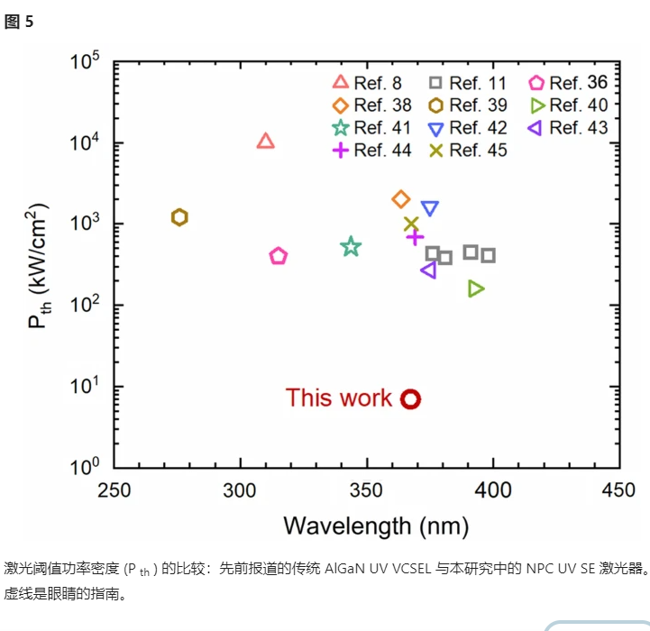 圖 5顯示了本研究中實現(xiàn)的激光閾值與先前報道的不同波長的傳統(tǒng) AlGaN UV VCSEL 的激光閾值的比較圖??梢钥闯觯瑢τ趥鹘y(tǒng)的AlGaN UV VCSEL,激射閾值在幾百kW/cm 2到MW/cm 2范圍內,并且激射閾值隨著激射波長的變短而增加,如虛線所示. 對于波長類似于本研究中波長的激光,閾值約為 0.7–1 MW/cm 2。相比之下,本研究中的激光閾值僅為 7 kW/cm 2左右。