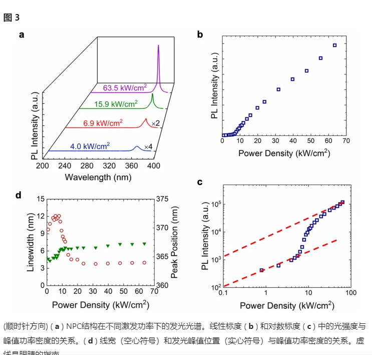 總之,在這項工作中,我們展示了使用 GaN epi-NPC 在紫外光譜范圍內產生超低閾值的 SE 激光。激光波長為 367 nm,閾值僅為 7 kW/cm 2(或 ~ 49 μJ/cm 2),與之前報道的類似激光波長的傳統(tǒng) AlGaN UV VCSEL 相比低兩個數(shù)量級。與近紫外光譜范圍內的傳統(tǒng) AlGaN VCSEL 相比,該激光閾值也低了一個數(shù)量級以上。進一步考慮到已經在 III 族氮化物納米線中建立的出色電摻雜54、55、56和完全外延工藝,這項研究為在紫外范圍內開發(fā)具有可控光束特性的電注入 SE 半導體激光器提供了一條可行的途徑,這與之前展示的具有半導體納米線的電注入紫外隨機激光器以及與其他現(xiàn)有半導體設備平臺的集成能力,以增加功能。