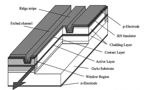 對于~ 640 nm的激光波長,一般采用AlGaInP材料體系。由于有源層與包層之間的導(dǎo)帶偏移較小,因此限制AlGaInP LD WPE的主要因素是由有源層載流子泄漏引起的熱飽和。此外,較小的偏移是由于較短的波長導(dǎo)致的,因為在有源層中有較高的準費米能級。因此,對泄漏的抑制是迫切需要實現(xiàn)高WPE的短波AlGaInP LD。窄條紋AlGaInP LD最大輸出的主要限制是小面鏡的災(zāi)難性光學(xué)損傷(COD)。為了在光面處實現(xiàn)高亮度的高密度光功率,光面鈍化是克服COD退化的重要手段。