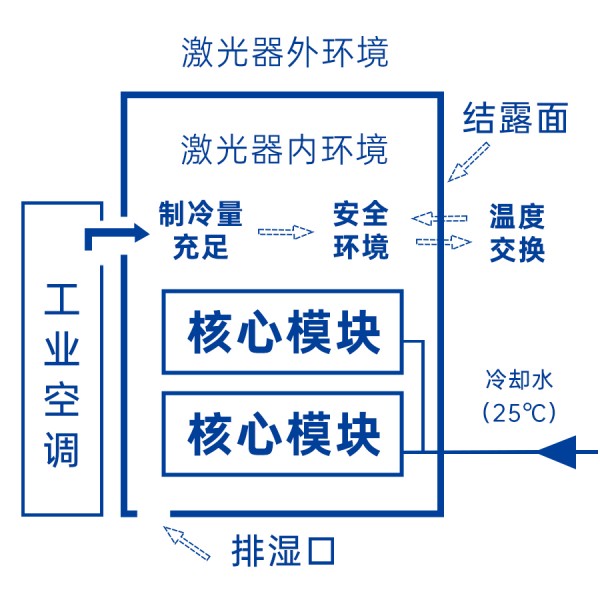 使用自帶空調且暴露在工作環境中的激光器時,空調的制冷和除濕作用會大大降低激光器內環境的露點溫度。一般設置工業空調的制冷溫度和冷卻水溫度一致。