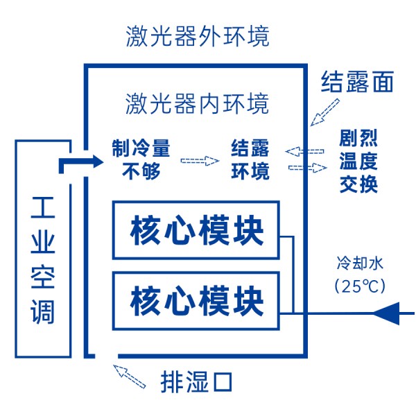 工業空調的制冷量不足以維持激光器內環境的安全,仍會出現內環境結露,時間一長,外環境也會跟隨結露。因此激光器四周不能有明顯熱源,水冷機的熱出風口不能正對激光器。