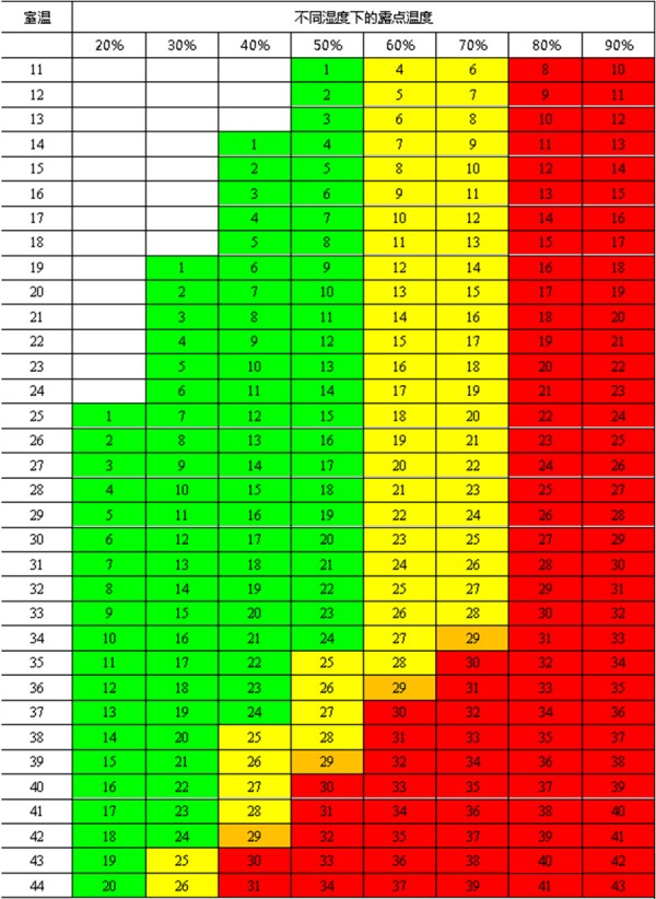 表格左側是當前工作環境溫度,頂邊是當前工作環境濕度,溫度和濕度參數的交叉點溫度就是此環境下的“露點溫度”。也即:在此環境中任何處于這個露點溫度以下的物體,其表面就會結露。因此調節原則如下: