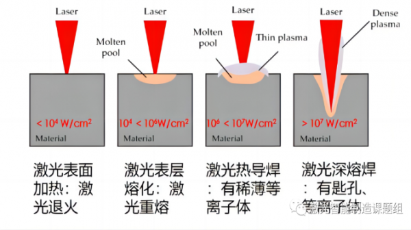 不同的激光輻射照度會引起材料產(chǎn)生不同的物態(tài)變化,反映在焊接工藝上就表現(xiàn)為兩種典型的焊接模式:激光熱導(dǎo)焊和激光深熔焊。兩者的傳熱過程、焊縫形成機(jī)制、工藝特點和應(yīng)用范圍有很大區(qū)別。