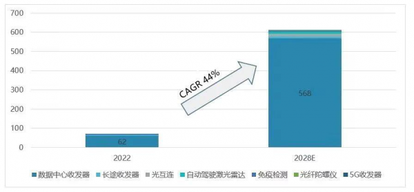 圖表 2:2022-2028E 硅光芯片市場規(guī)模(單位:百萬美元)。數(shù)據(jù)來源:Yole、RimeData 來覓數(shù)據(jù)整理