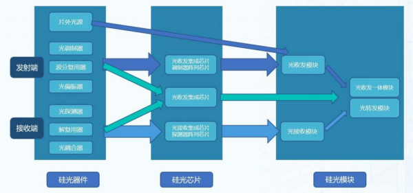 硅光芯片中的光器件可以分為有源器件和無源器件。有源器件包括激光器、調(diào)制器和光電探測器;無源器件包括平面波導、光柵或邊緣耦合器等。基于這些器件,可以構(gòu)成光發(fā)射 / 接收芯片,并開展陣列化的應用,最終通過光子集成技術(shù)(PIC)來實現(xiàn)硅光芯片。硅光產(chǎn)業(yè)可分為三個層次:硅光器件、硅光芯片和硅光模塊。硅光器件包括光源、調(diào)制器、探測器、波導等,是實現(xiàn)各種功能的基本單元;硅光芯片是指將光發(fā)送集成芯片、光接收集成芯片、光收發(fā)集成芯片、相同功能器件陣列化集成芯片(探測器陣列芯片、調(diào)制器陣列芯片等)等若干基本器件進行單片集成;硅光模塊是指進一步將光源、硅光器件 / 芯片、外部驅(qū)動電路等集成到一個模塊,包括光收發(fā)模塊、光接收模塊和光收發(fā)一體模塊等,是系統(tǒng)級的硅光產(chǎn)品形態(tài)。