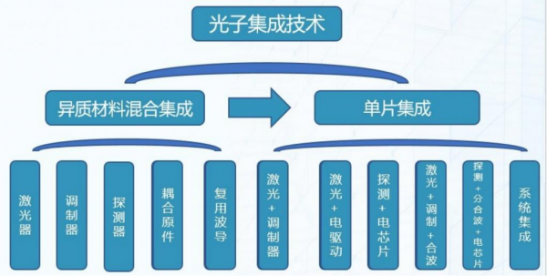 業(yè)內(nèi)認為,硅光芯片可以分為三個階段:第一階段為硅器件逐步取代分立元器件,即用硅把光通信底層器件做出來,達到工藝的標準化;第二階段為集成技術(shù)從耦合集成向單片集成演進,實現(xiàn)部分集成,再把這些器件像堆積木一樣組合起來,集成不同的芯片;第三階段為光電一體技術(shù)融合,實現(xiàn)光電全集成化。根據(jù)中科院半導體研究所的王啟明院士介紹,目前硅光芯片技術(shù)正發(fā)展到第二階段。硅光芯片要實現(xiàn)大規(guī)模應用,需要依托硅材料與不同種類光電材料的異質(zhì)集成,以充分發(fā)揮各種材料的優(yōu)異特性。