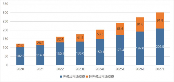 圖表 6:2020-2027E 硅光模塊市場規(guī)模(單位:億美元)。數(shù)據(jù)來源:Light Counting、RimeData 來覓數(shù)據(jù)整理