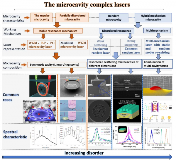 最近,材料、微納技術和人工智能的快速發展為復雜激光器的產生、控制和應用帶來了新的機遇和挑戰。在此,天津航海儀器研究所、電子科技大學和深圳大學的研究人員(天津市量子精密測量重點實驗室朱洪楊博士和電子科技大學光纖傳感與通信教育部重點實驗室博士研究生何真為共同第一作者,電子科技大學的張偉利教授和深圳大學高等研究院的馬瑞副研究員為通信作者)從微腔結構無序度漸增的視角出發,系統地研究了各種類型的微腔復合激光器的產生、調控及前沿應用進展。主要介紹了無序微腔激光器的歷史發展、特點、規律和應用,并對微腔復合激光器的未來發展趨勢進行了討論。該成果以“Microcavity complex lasers:from order to disorder”為題,以特邀綜述發表于ANNALEN DER PHYSIK上。