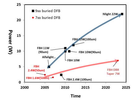 780 nm激光器是堿金屬蒸汽激光器(DPAL)的關(guān)鍵泵浦光源,在精密科學(xué)、工業(yè)加工以及國(guó)防領(lǐng)域中具有廣泛需求。然而,傳統(tǒng)的Fabry-Pérot(FP)激光器雖然功率高,但光譜寬度過大且波長(zhǎng)穩(wěn)定性差,難以滿足應(yīng)用需求。分布反饋(DFB)激光器因其嵌入布拉格光柵,可實(shí)現(xiàn)窄譜寬和良好的波長(zhǎng)穩(wěn)定性,成為理想選擇。然而,在實(shí)現(xiàn)高功率和窄譜寬兼顧的同時(shí),仍存在諸多技術(shù)難題。DFB激光器發(fā)展歷程如圖1所示,相比于9xxnm器件,7xxnm 芯片的功率的發(fā)展是相對(duì)落后,這主要受到市場(chǎng)需求和材料的限制,需要解決的問題也就是功率提升和內(nèi)置光柵的生長(zhǎng)。