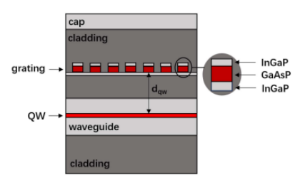 光柵區(qū)域采用了低損耗、低應(yīng)力的三層InGaP/InGaAsP/InGaP結(jié)構(gòu),避免了傳統(tǒng)材料(如GaAsP)中因應(yīng)力導(dǎo)致的光柵吸收和缺陷問題。優(yōu)化的二次外延工藝進(jìn)一步減少了界面氧污染,使氧含量降至1E16數(shù)量級(jí),大幅提升了器件效率和可靠性。
