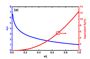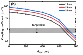 該研究團(tuán)隊(duì)基于耦合模理論(CMT)構(gòu)建了光柵分析模型,通過調(diào)整光柵耦合強(qiáng)度(κL控制在0.4-0.6之間)和光柵與量子阱的相對(duì)位置,計(jì)算結(jié)果如圖2所示,較小的光柵耦合系數(shù)會(huì)帶來外耦合光的比例增加,從而提高功率和效率。較遠(yuǎn)的光柵位置顯著降低了光損耗和載流子復(fù)合的影響,確保了較高的輸出功率和低電壓。