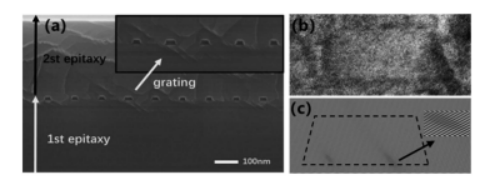 圖3 (a) DFB在外延方向的橫截面和光柵的掃描電鏡(SEM)圖像,標(biāo)記了二次外延的開始。插圖顯示了光柵的放大視圖。(b)lnGaAsP光柵的透射電鏡圖像,(c)傅里葉變換后的高分辨率圖像。