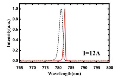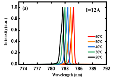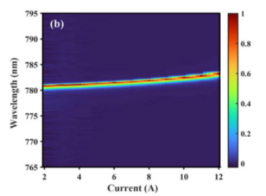 研究人員在12 A電流和20 °C溫控下對(duì)器件進(jìn)行了性能測(cè)試,如下圖5和圖6所示,激光器實(shí)現(xiàn)了連續(xù)輸出功率超過10 W,光譜寬度(FWHM)小于0.5 nm。這一功率水平創(chuàng)下了780 nm波段DFB激光器的最高紀(jì)錄,同時(shí)在寬電流與溫度范圍內(nèi)保持了良好的鎖波特性。
