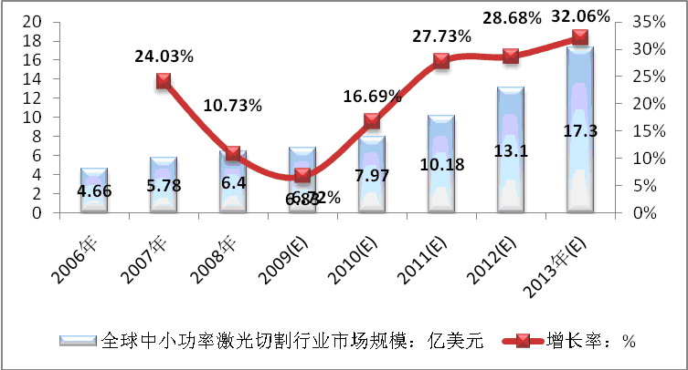 據《工業激光解決方案》(ILS)統計,2008年全球激光加工(laser oem)設備銷售額約為63.6億美元;其中中小功率激光切割(laser cutting)機(laser cutting)約占全球份額的10%,市場規模約為6.4億美元。2009年,受全球金融危機影響,中小功率激光切割(laser cutting)機(laser cutting)行業增長顯著減緩,預計銷售額為6.83億美元。2010年以后將恢復增長,到2013年,預計全球中小功率激光切割(laser cutting)機(laser cutting)行業規模將達到17.3億美元。