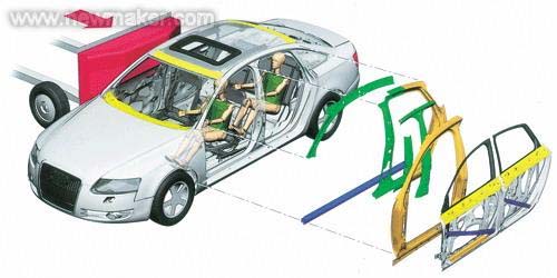 奧迪A6的車身強(qiáng)度和鋼度一直備受贊揚(yáng),國(guó)產(chǎn)全新奧迪A6L在原有基礎(chǔ)上進(jìn)行了再次改進(jìn):采用了激光拼焊技術(shù)的車身設(shè)計(jì)(如圖3)。新奧迪A6L經(jīng)過(guò)強(qiáng)化的車身,其抗扭轉(zhuǎn)強(qiáng)度提高了34%。配合全新的車身、底盤(pán)設(shè)計(jì)加之采用先進(jìn)激光焊接技術(shù)的堅(jiān)固車身結(jié)構(gòu),使國(guó)產(chǎn)全新奧迪A6L在遭遇碰撞時(shí),預(yù)測(cè)的車身變形區(qū)、側(cè)面防撞保護(hù)梁以及合理的車內(nèi)空間結(jié)構(gòu)等能夠?yàn)槌丝吞峁┯行ПWo(hù)。這些看不到摸不著的設(shè)計(jì)和選材不但能降低車輛的制造成本和重量,還能在關(guān)鍵時(shí)刻最大限度地保護(hù)乘客的生命安全。