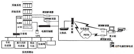 采用預(yù)埋設(shè)備的方法,系統(tǒng)相對固定,因此系統(tǒng)規(guī)模相對較大,功能也較為齊全,系統(tǒng)主要包括以下部分:中央控制管理系統(tǒng)、探測站(數(shù)據(jù)采集及前置處理設(shè) 備)、車號自動識別裝置、標(biāo)定裝置及其他輔助設(shè)備(圖3)。考慮到方便操作、經(jīng)濟(jì)實惠等原則,探測站系統(tǒng)進(jìn)行集成配置,包括多套激光測距傳感器、車輪傳感 器、主機(jī)系統(tǒng)、微波天線、分線箱、電纜及整體鋼枕系統(tǒng)等。