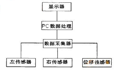 與定子高度測量一樣,該系統(tǒng)也是采用三角法激光測距,監(jiān)測儀由2個激光傳感器組成,分別測量感應(yīng)板的兩邊,通過位移傳感器等間距采樣并計算當(dāng)前的里程,然 后經(jīng)計算機(jī)處理分析后在顯示屏上顯示實時測量結(jié)果,測量小車采樣頻率高,可達(dá)到16kHz,測量精度≥0.04min,可進(jìn)行事件觸發(fā)(即發(fā)現(xiàn)數(shù)據(jù)超標(biāo)才 開始記錄,以節(jié)約內(nèi)存空間),傳感器的采樣間隔可調(diào),數(shù)據(jù)處理可靠,不失真。系統(tǒng)構(gòu)成圖和主體示意圖分別如圖4和圖5所示。