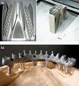 圖 3:a)通常,LayerWise公司制造出的產品是很難用任何其他方法制造出來的。LayerWise公司并不會因為零件的形狀復雜而加收額外的費用, 因為其生產成本是由零件的重量決定的。b)通過專利的DentWise技術,完全消除了傳統的模壓或鉆孔加工方式對幾何形狀和表面的限制。