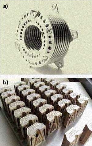圖2:a)LayerWise公司應用SLM技術,通過單一生產步驟制造出了包含9個凹陷部分和6個內部腔的燃燒器,完全取代了傳統的復雜裝配。b)在生產注塑模具過程中加入最佳冷卻通道,可以顯著提高注塑成型的質量和速度。