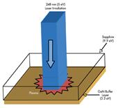 LED激光剝離的基本原理是利用外延層材料與藍寶石材料對于紫外激光具有不同的吸收效率。藍寶石具有較高的帶隙能量(9.9 eV),所以藍寶石對于248nm的氟化氪(KrF)準分子激光(5 eV輻射能量)是透明的,而氮化鎵(約3.3 eV的帶隙能量)則會強烈吸收248nm激光的能量。正如圖4所示,激光穿過藍寶石到達氮化鎵緩沖層,產(chǎn)生一個局部的爆炸沖擊波,在氮化鎵與藍寶石的接觸面進行激光剝離。基于同樣的原理,193nm的氟化氬(ArF)準分子激光可以用于分離氮化鋁(AlN)與藍寶石。具有6.3 eV帶隙能量的氮化鋁可以吸收6.4 eV的ArF激光輻射,而9.9 eV帶隙能量的藍寶石對于ArF準分子激光則是透明的。