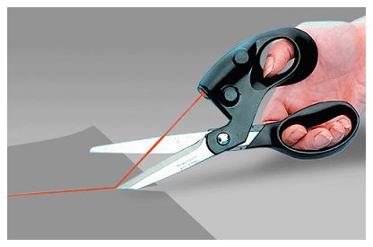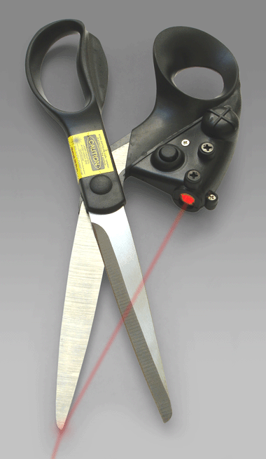 這把剪刀的刀把上嵌有一個激光發射器,如圖所示,發射出的激光投射在待剪物體表面,為使用者指明了剪刀前進的方向。不曉得這算不算軍用激光制導技術在民用產品上的首例...