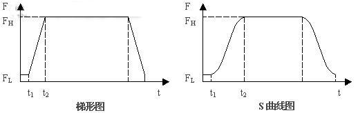 在高速往返運動和快速行推進過程中,如果不加技術處理,如梯形圖所示,在加速度很大的高速運動過程中,就會出現振動、沖擊,圖形就會出現不規則的錯位,嚴重時就會出現類似波紋狀的變形。如果將加速度減小,則增速時間(t2-t1)就很大,由于加工區在高速段(FH勻速段),這樣就造成有效加工幅面減小。為了解決這個問題,在變速運動中采用S曲線,可以使運動在很短的時間里,由低速向高速或由高速向低速平緩地過渡。經過現場反復的實驗,在同一設備上,可以大大的提高工作效率和圖形的加工質量。